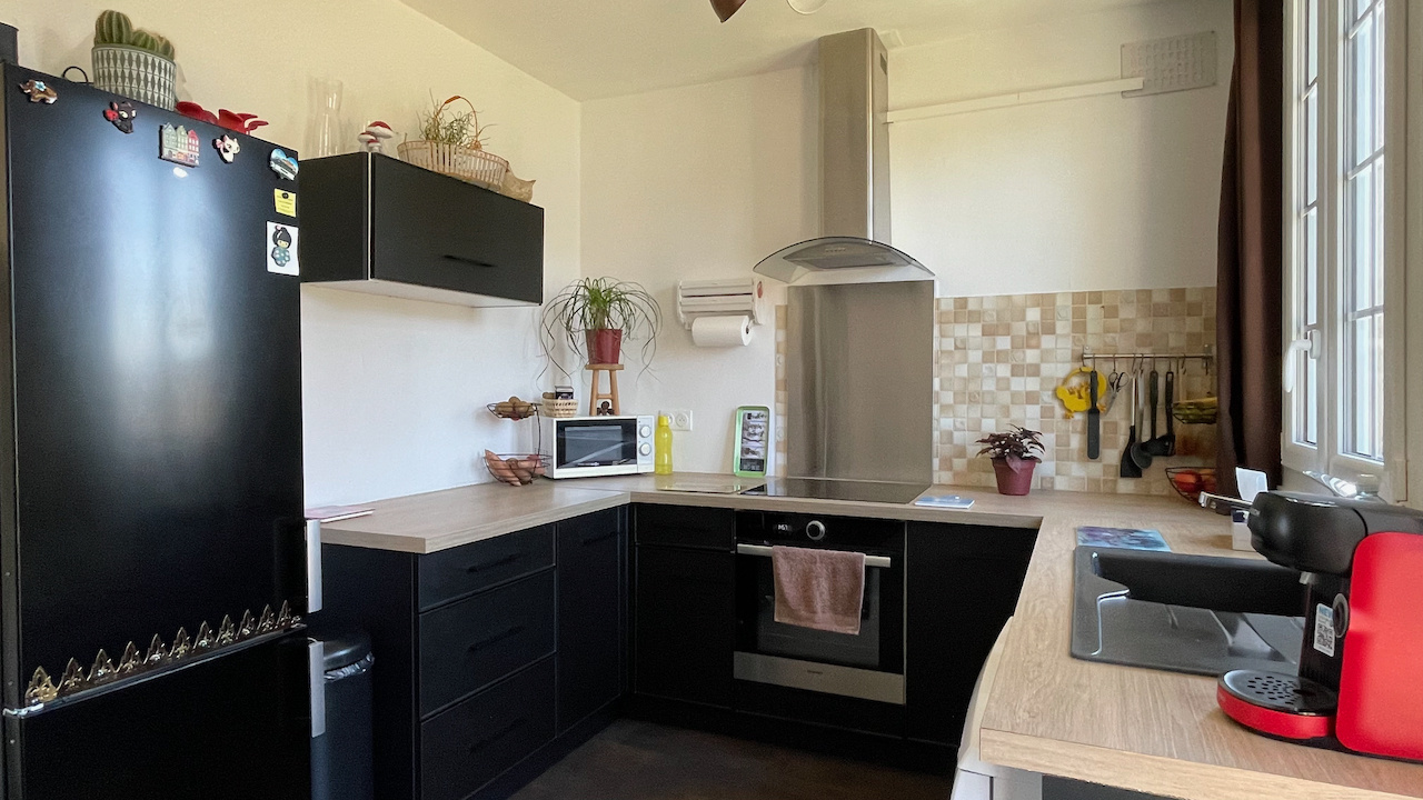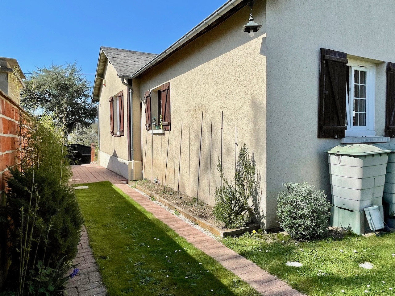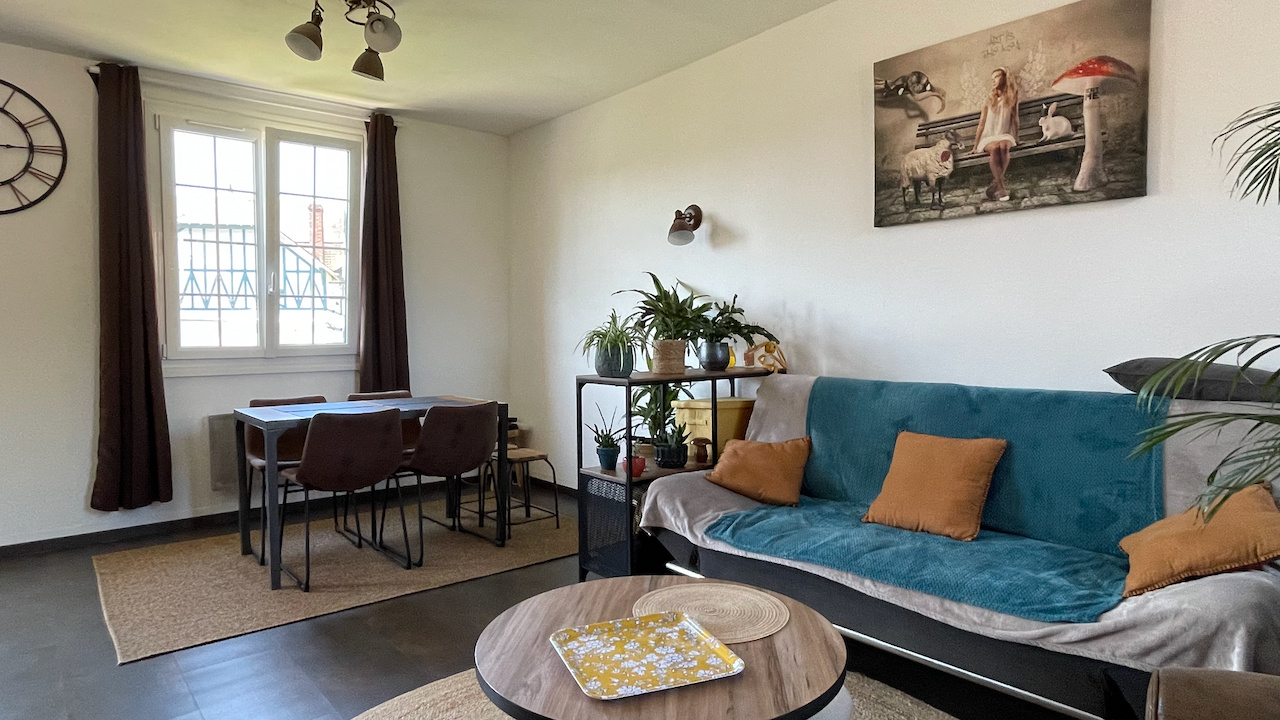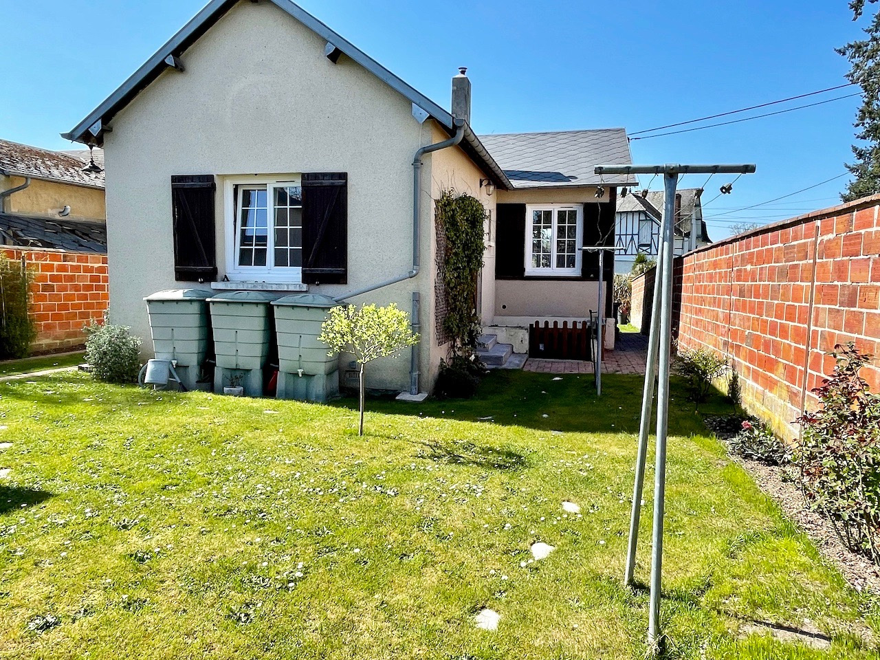 Conches-en-Ouche (27190)COUP DE COEUR. Dans un quartier calme, à pied du centre ville de Conches et des écoles, charmante maison de plain pied lumineuse et rénovée sur un terrain clos de murs et planté de 332 m2 avec un garage indépendant. La maison se compose d'un salon doté d'un poêle à granulés et une cuisine équipée ouverte, un couloir distribuant une chambre, un bureau avec placards pouvant faire chambre d'enfant, une salle de bains et un Wc séparé. Accessible par l'extérieur : une cave partielle. Et sur le terrain, un garage indépendant complète le bien (toiture neuve). Chauffage par poôle à granulés et radiateurs électriques. Raccordement au tout à l'égout. Fibre installée.