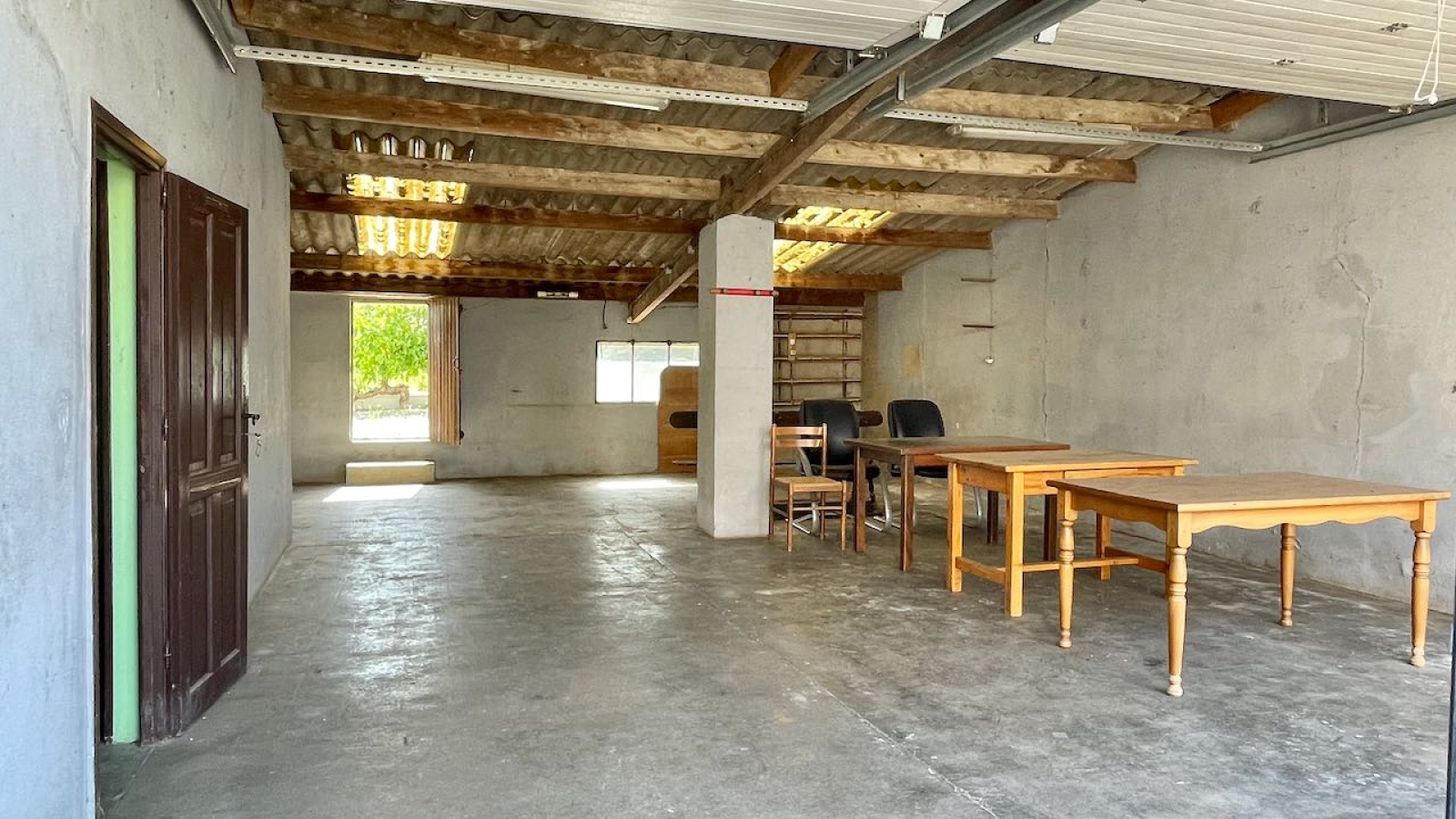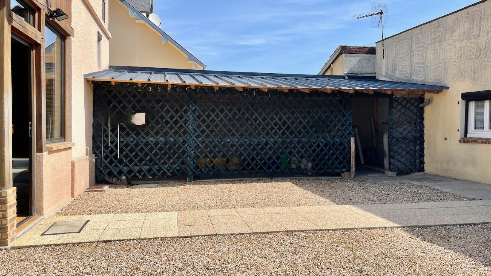 Dans la cour, un auvent couvert en bac acier et grand bâtiment abritant : un double garage (hauteur 2,40 m), 2 pièces aveugles et 2 autres pièces pouvant être aménagées pour une surface totale de 95 m2.