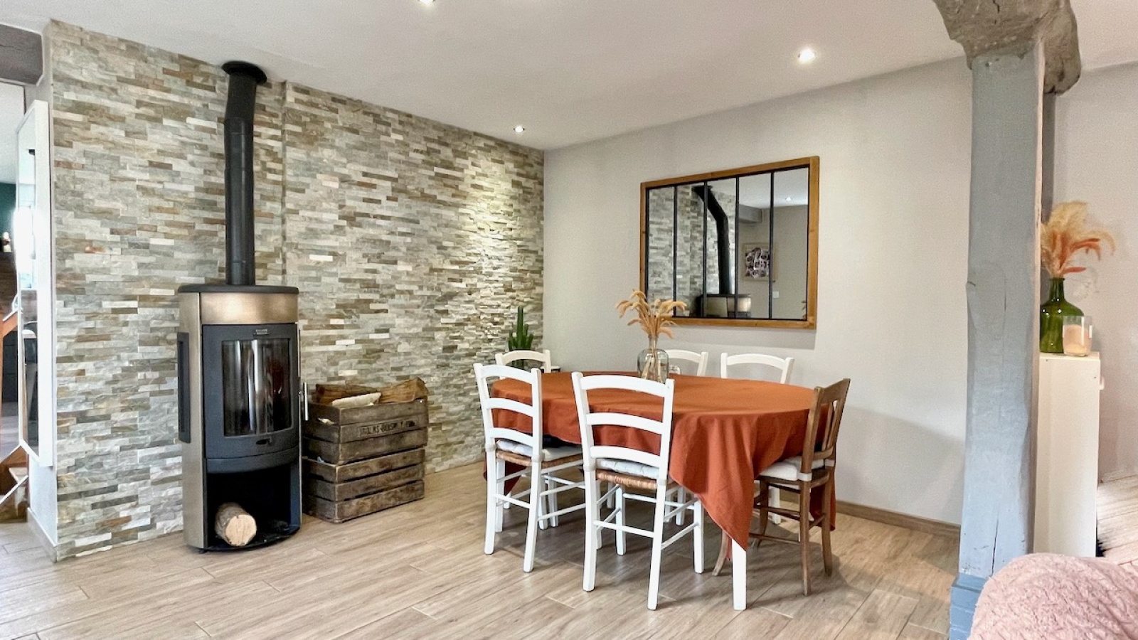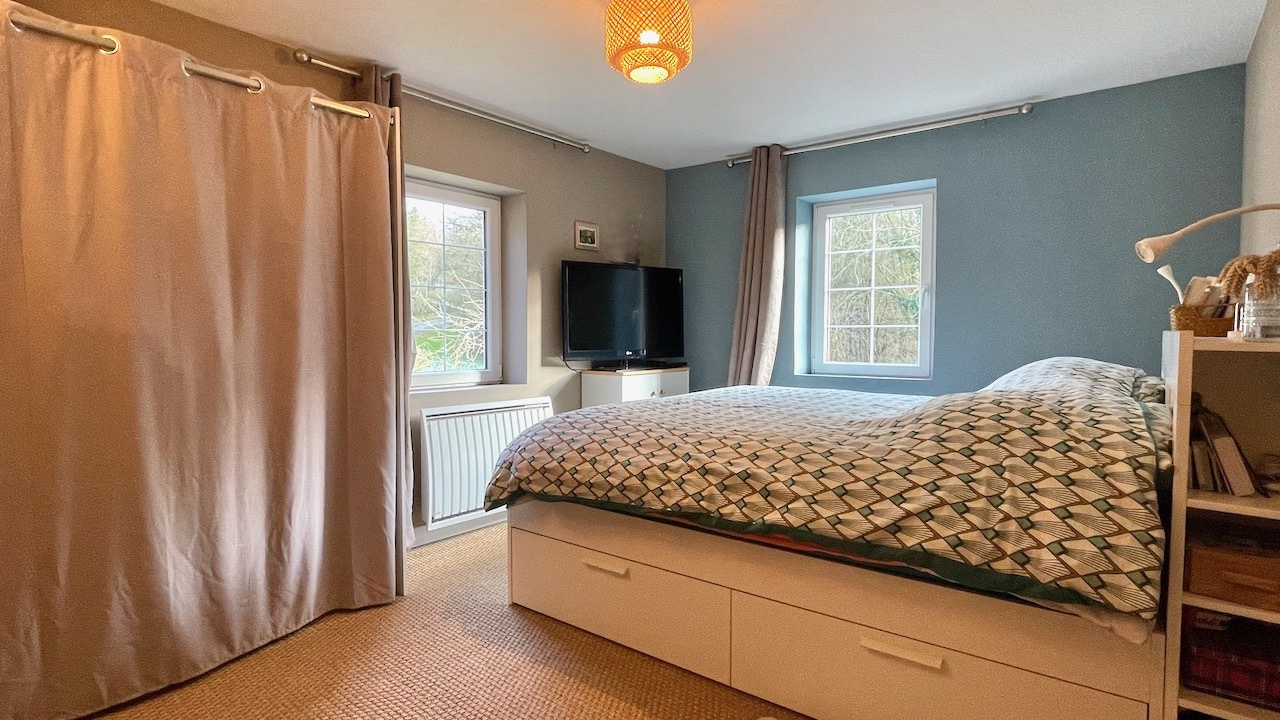 Chauffage électrique et poêle à bois, fenêtres PVC double vitrage. Toiture neuve en ardoises. Assainissement individuel.