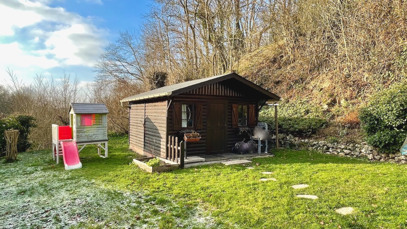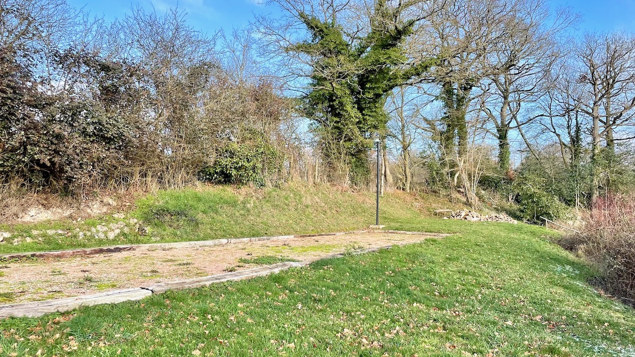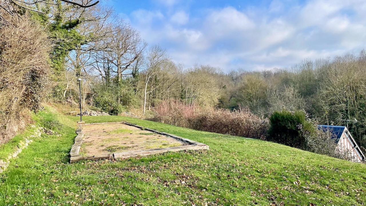 Sur le terrain en 2 paliers, vous aurez en dépendances un chalet bois (isolé avec radiateur et électricité), un garage avec bûcher attenant. Une cave voûtée et un boulodrome complètent les extérieurs.