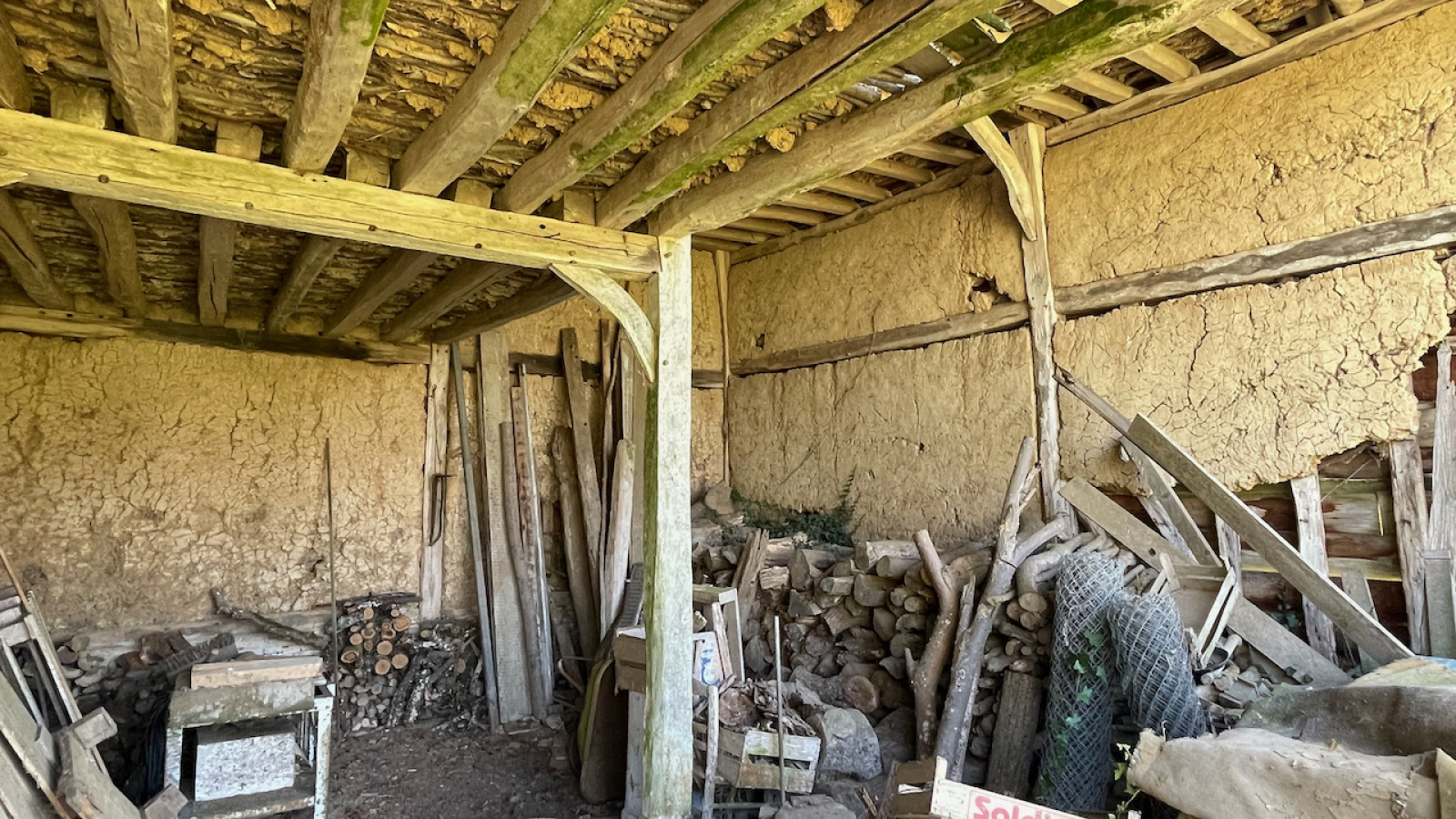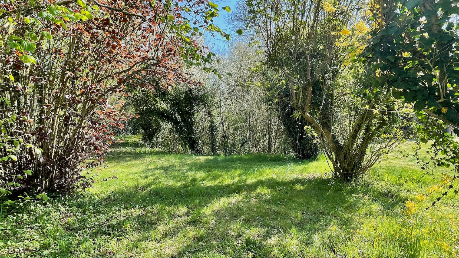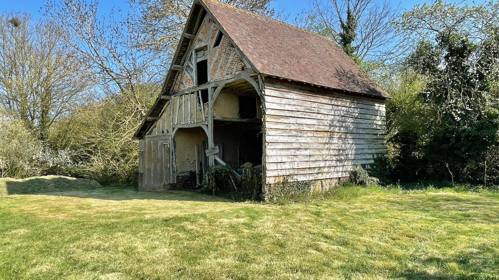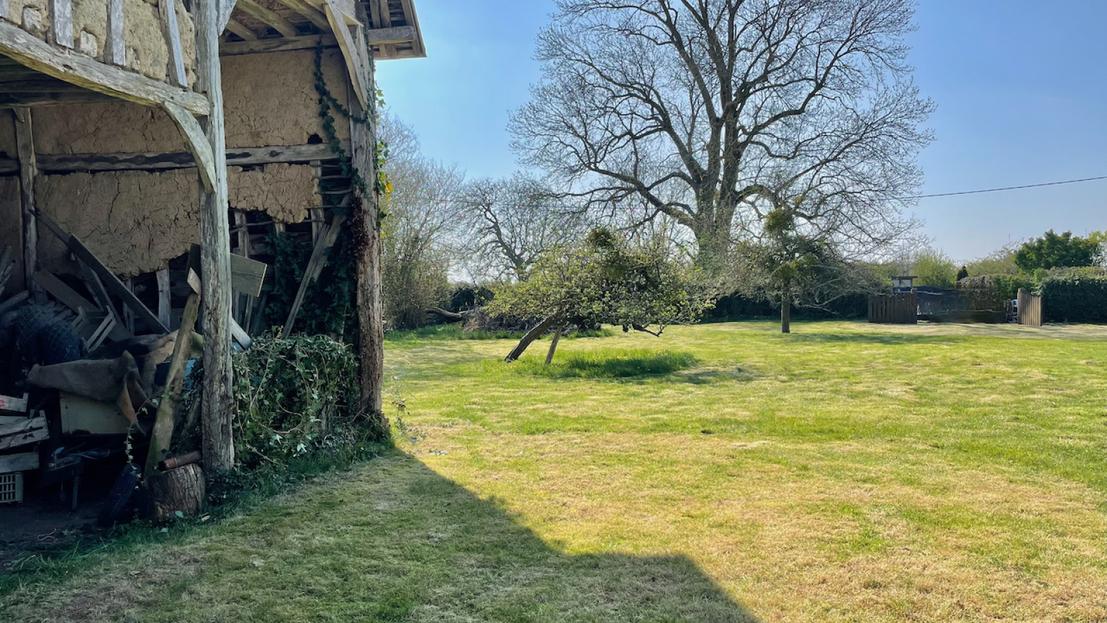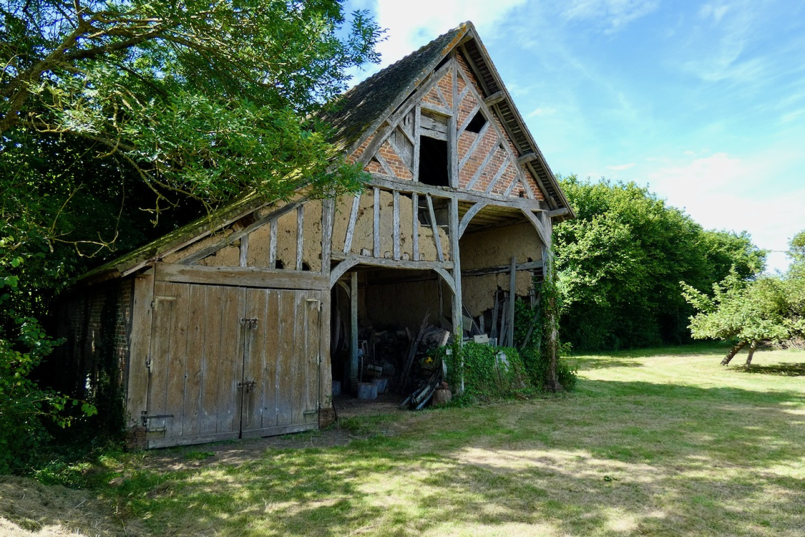 Sur le terrain de 2809 m2 avec plusieurs pommiers, une grange couverte de tuiles avec partie garage et une petite mare.
