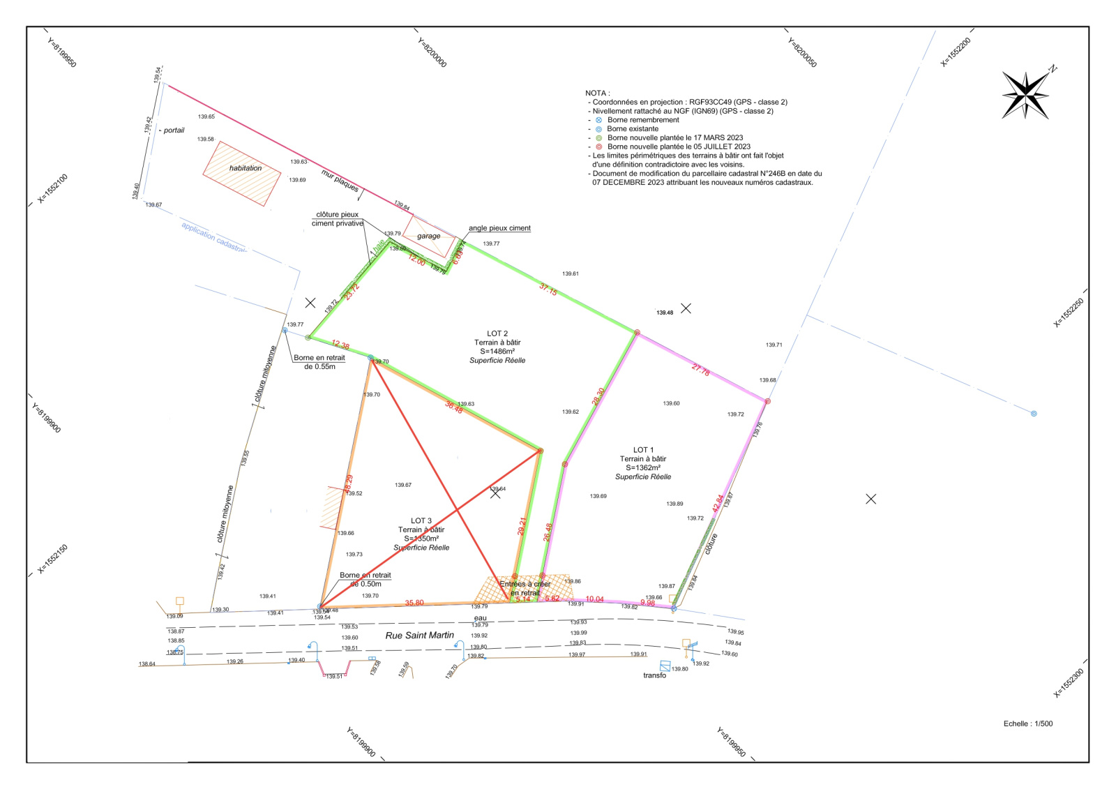 Lot n° 2: surface de 1486 m2 (en vert sur le plan)