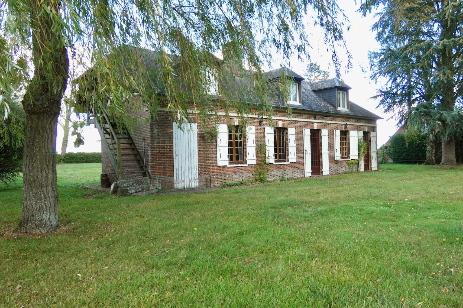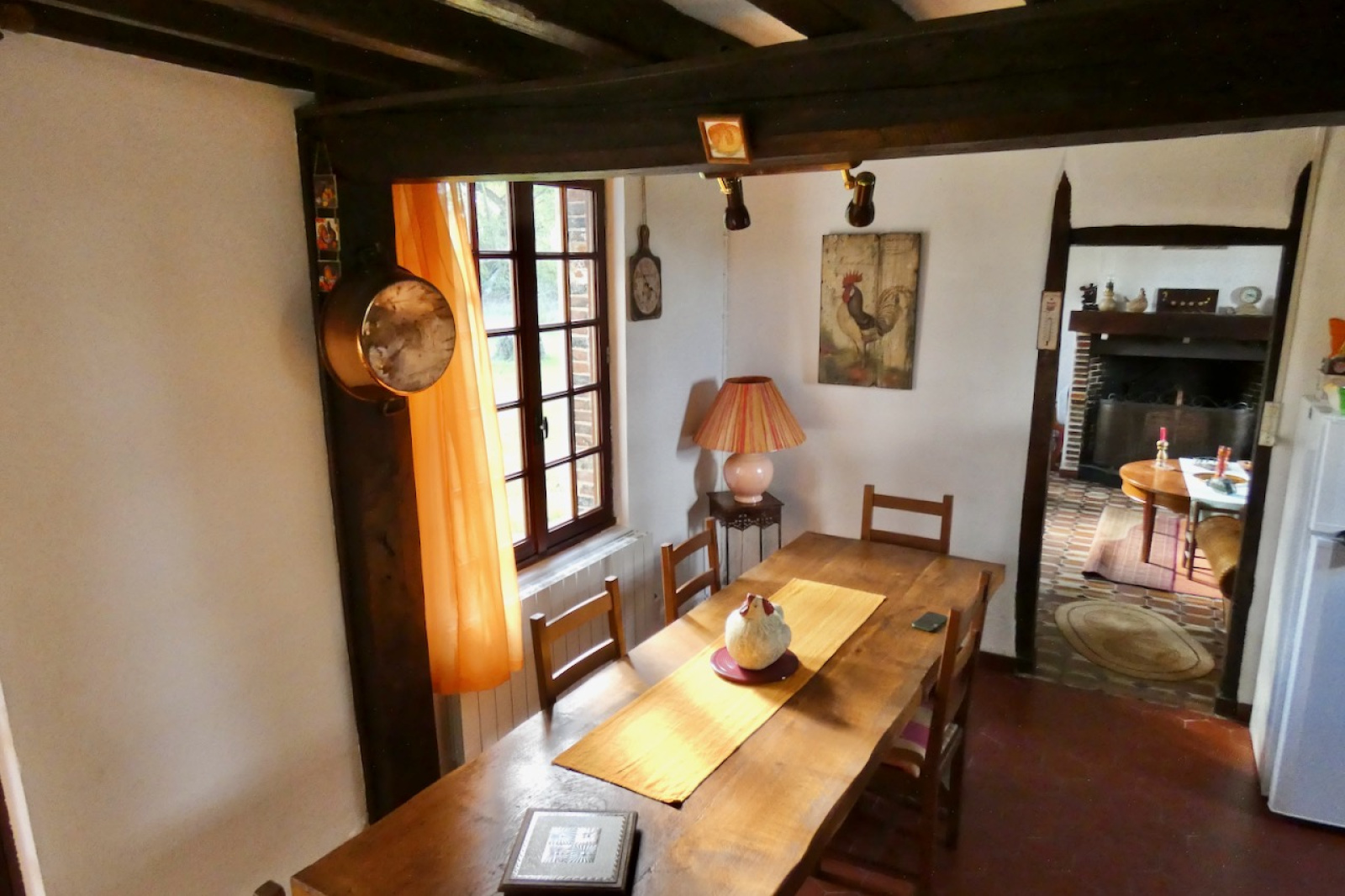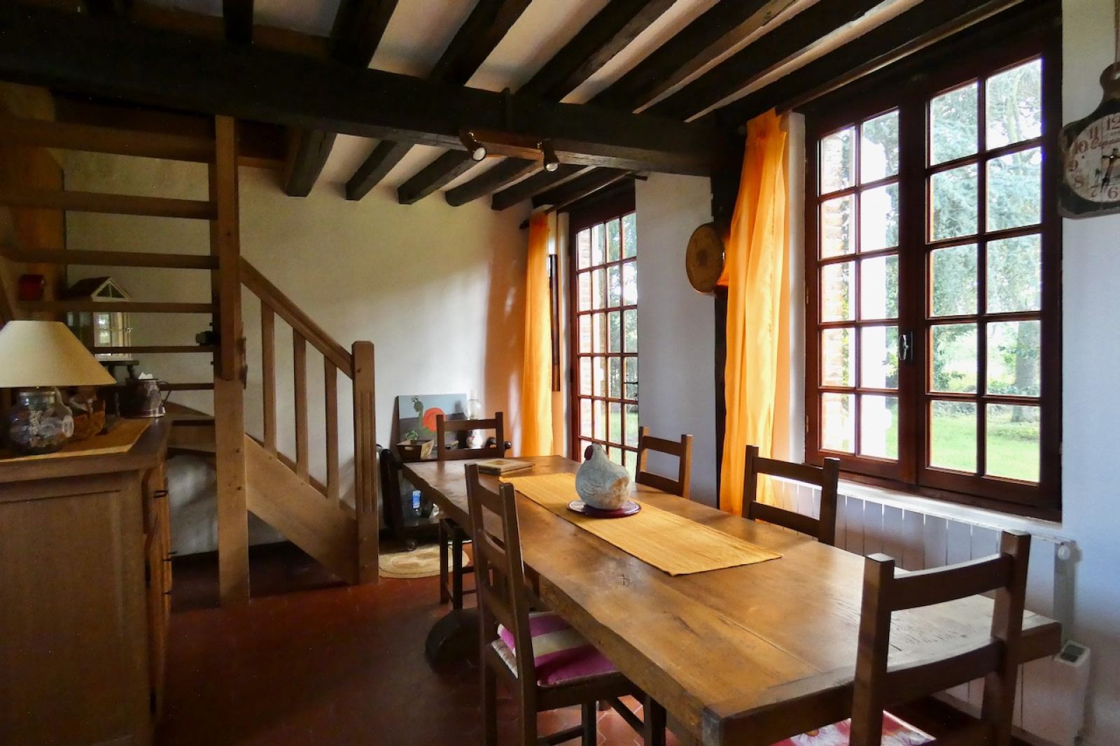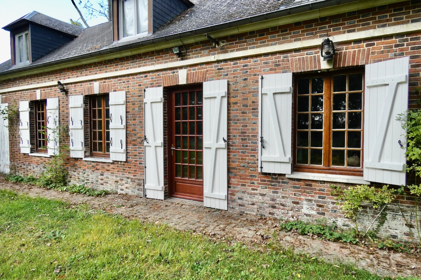 Romilly-la-Puthenaye (27170)Réf 4626. Entre Conches et la Ferrière sur Risle, sur un terrain boisé et clôturé de 2743 m2, longère de 1852 avec 3 chambres. Au rdc, salon traversant avec cheminée, cuisine salle à manger avec accès au jardin, grande chambre et salle d'eau avec WC. A l'étage entièrement parqueté, palier pouvant servir de bureau et 2 chambres en enfilade. Un escalier extérieur dessert une des 2 chambres de l'étage. Toiture ardoises. Simple vitrage au rdc. Double vitrage à l'étage. Assainissement par fosse sceptique. Eau chaude par chaudière gaz de 2012. Carport sur le terrain. Et un garage sur dalle ciment pouvant être aménagé en pièce supplémentaire. Aucun vis à vis, très au calme. Commerces à 5 km et gare axe Paris Caen à 1 km.