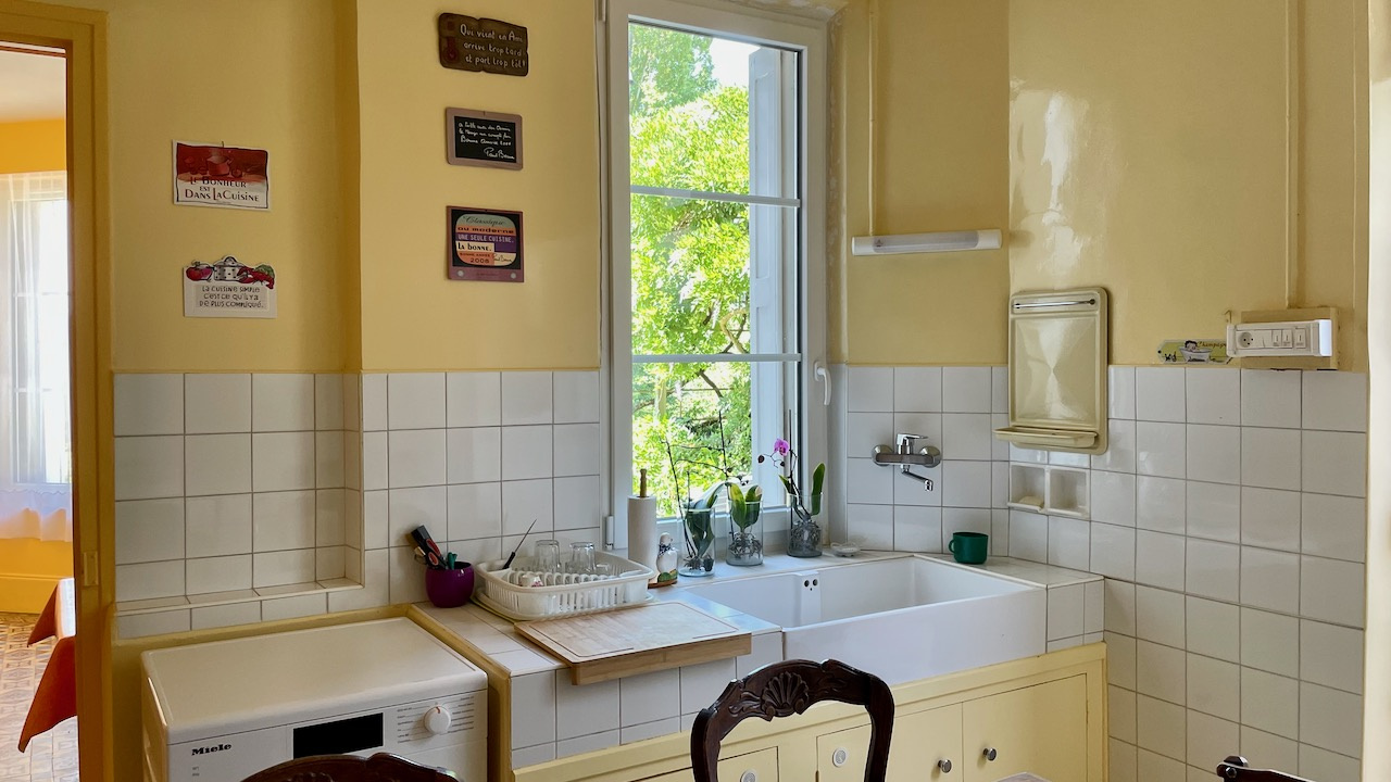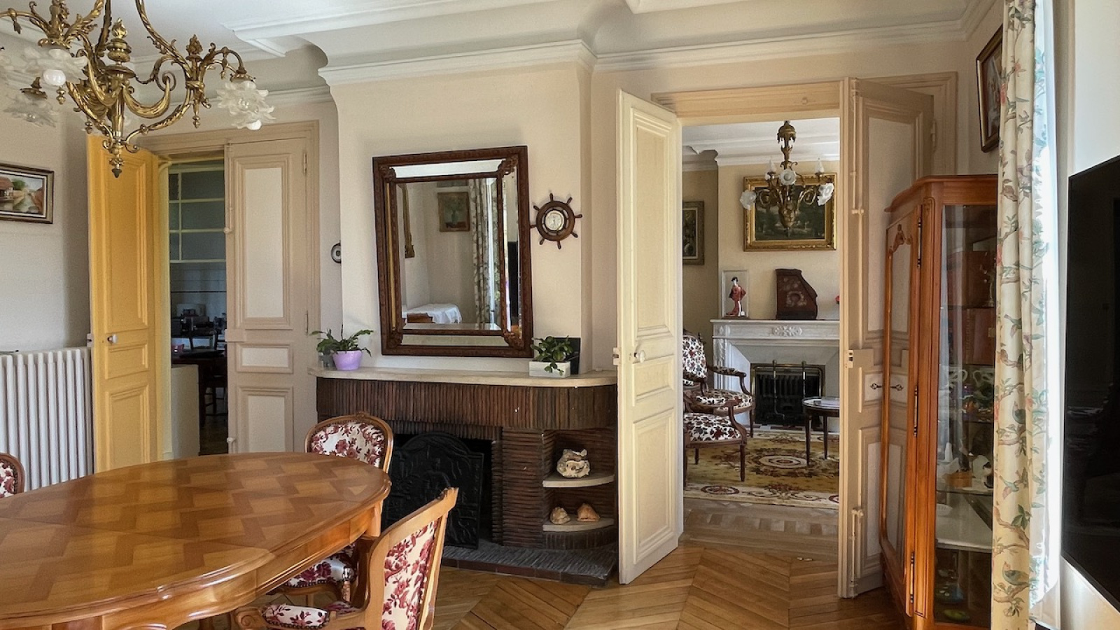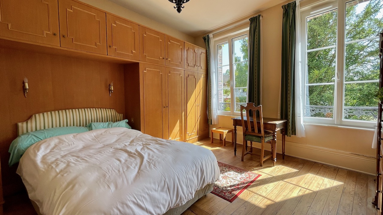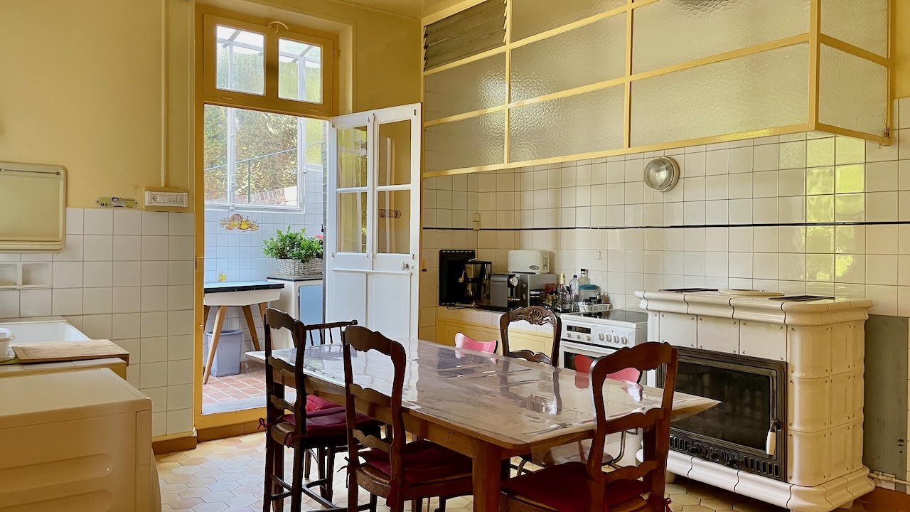 Rdc: entrée, cuisine, arrière-cuisine, séjour parqueté et cheminée, salon parqueté et cheminée avec fenêtre en saillie donnant sur le parc, pièce pouvant avoir usage de chambre, WC.