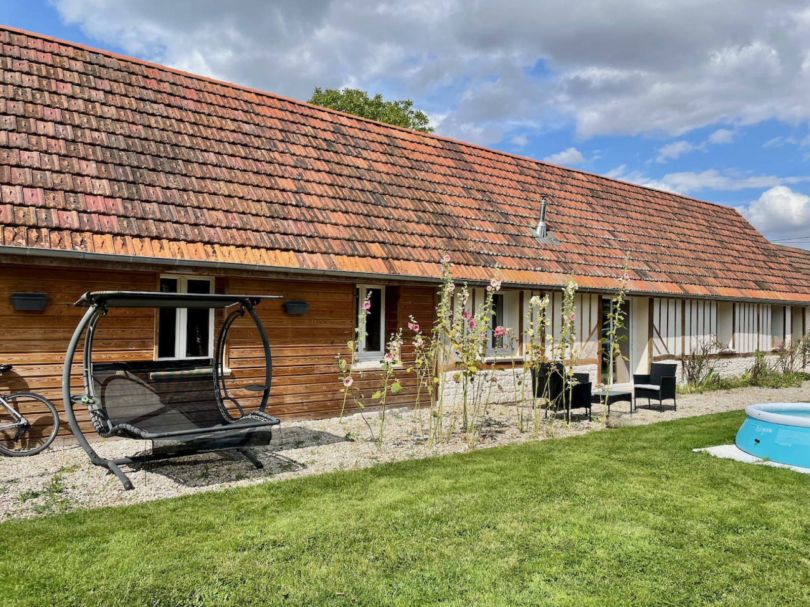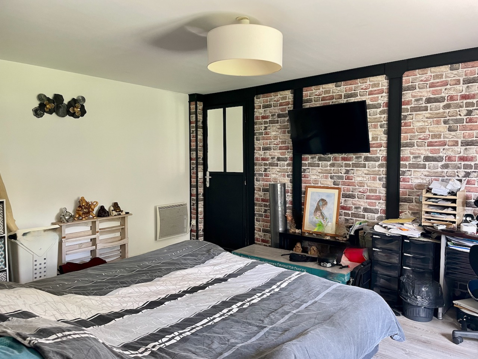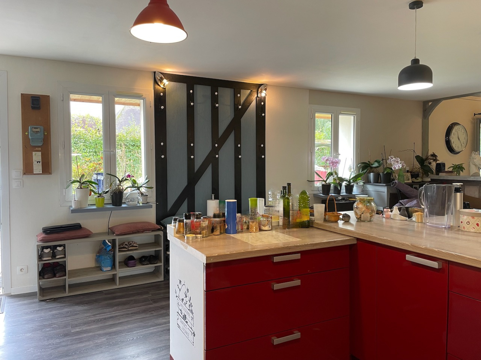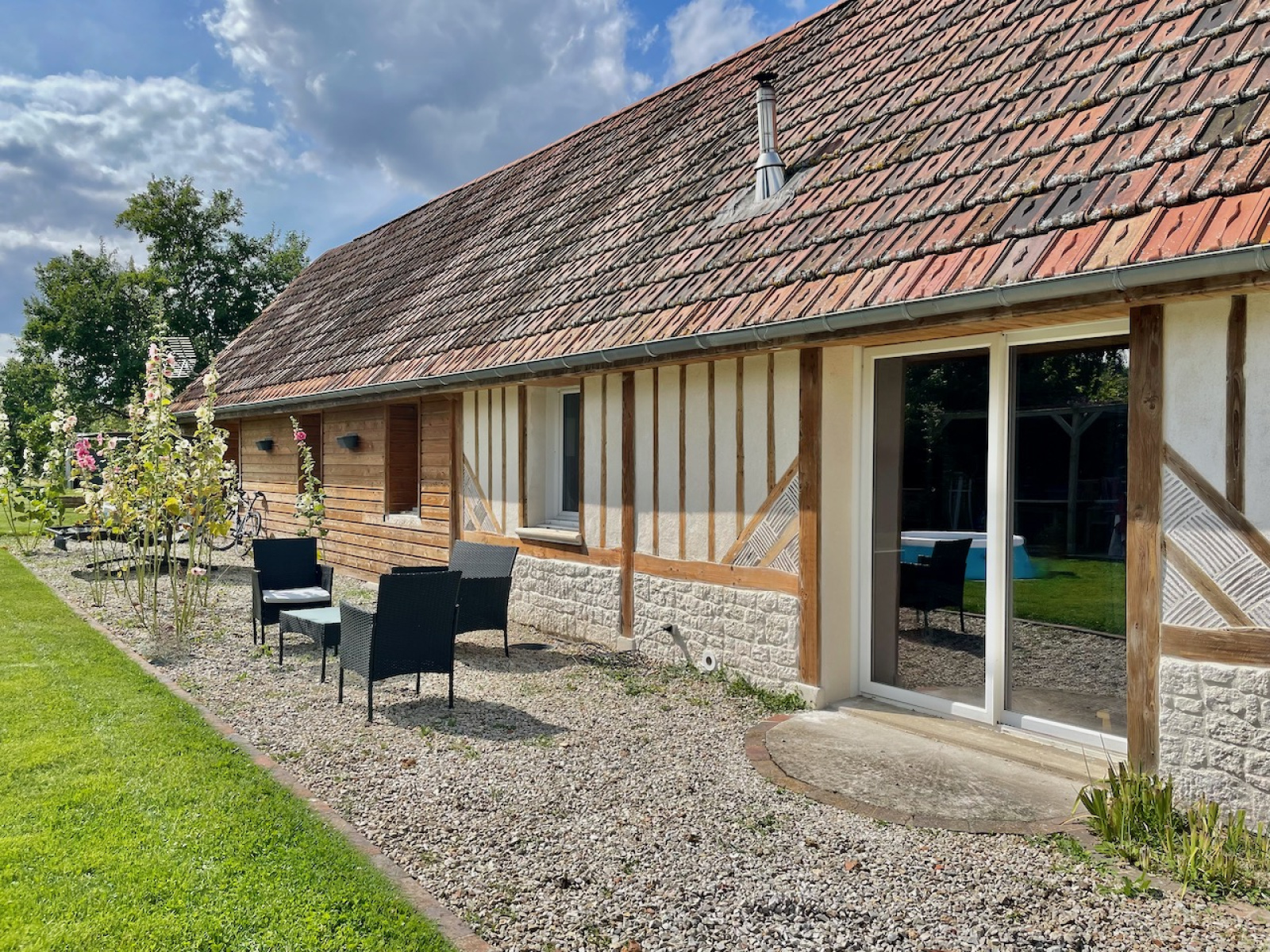 Bémécourt (27160)Située à 3 km de Breteuil, longère rénovée de 7 pièces sur un terrain clos de 1891 m2. Couverte en tuiles, la maison est exposée plein sud et sans vis à vis. Elle se compose d'une pièce de vie lumineuse de plus de 50 m2 avec salon cathédrale et poêle à granulés, une cuisine ouverte toute équipée, une buanderie, une salle de bains avec baignoire, douche, double vasque et Wc séparé. Un couloir dessert 4 chambres dont une suite avec dressing aménagé. Une pièce en mezzanine surplombant le salon peut accueillir une salle de jeux, bureau ou chambre d'amis. Chauffage par poêle à granulés. Double vitrage PVC sur l'ensemble. DPE C. Assainissement individuel aux normes. Fibre raccordée. Attenante à la maison, une pièce raccordée en eau et électricité peut accueillir un atelier ou une chambre indépendante. De plus, une remise sur dalle béton permet du stockage supplémentaire. Sur le terrain, une terrasse en bois avec pergola, un abri de jardin et nombreux fruitiers. Ecole primaire à pied. Gare de Verneuil (axe Paris Montparnasse) à 14 km.