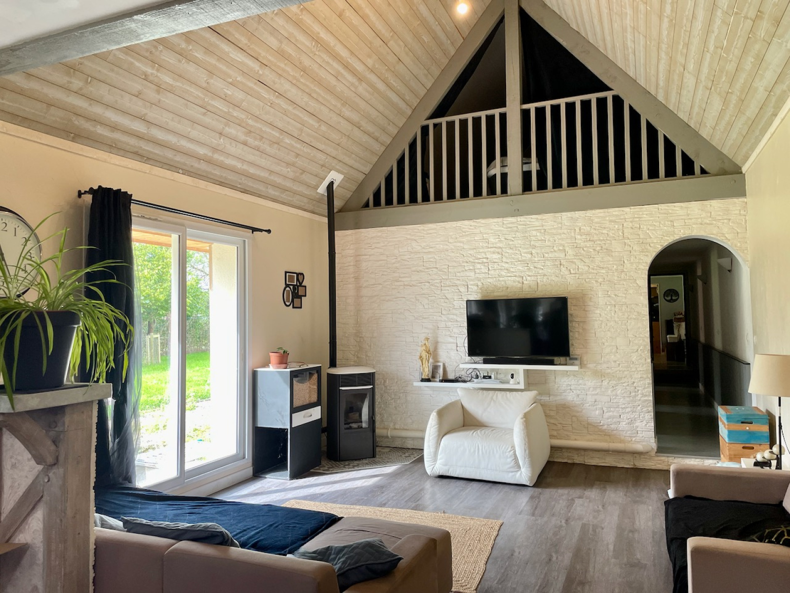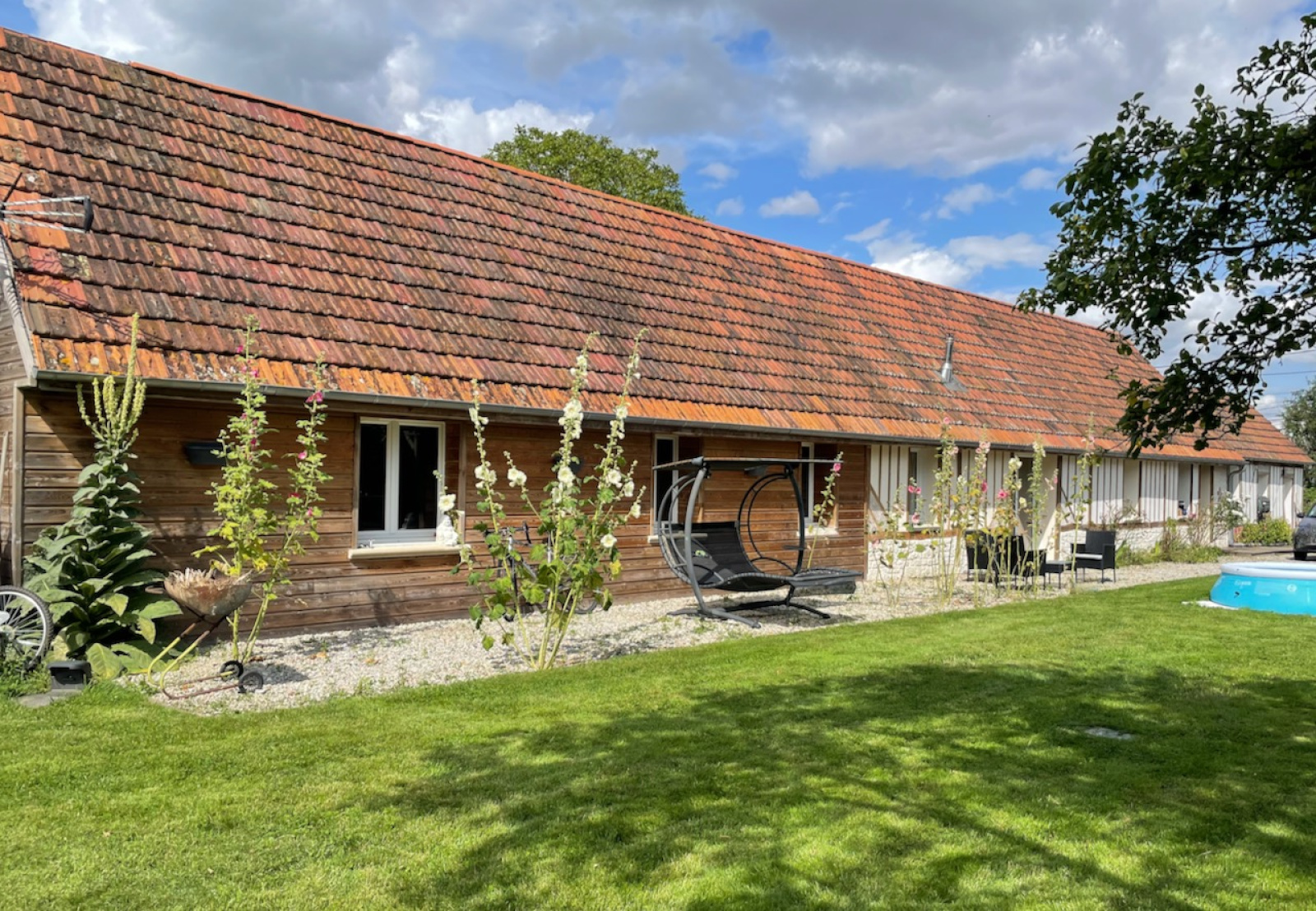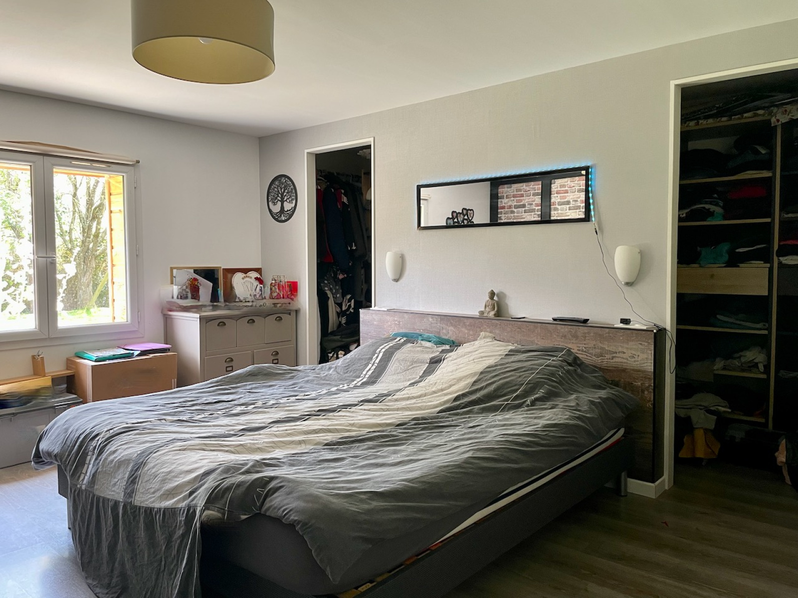Bémécourt (27160)Située à 3 km de Breteuil, longère rénovée de 7 pièces sur un terrain clos de 1891 m2. Couverte en tuiles, la maison est exposée plein sud et sans vis à vis. Elle se compose d'une pièce de vie lumineuse de plus de 50 m2 avec salon cathédrale et poêle à granulés, une cuisine ouverte toute équipée, une buanderie, une salle de bains avec baignoire, douche, double vasque et Wc séparé. Un couloir dessert 4 chambres dont une suite avec dressing aménagé. Une pièce en mezzanine surplombant le salon peut accueillir une salle de jeux, bureau ou chambre d'amis. Chauffage par poêle à granulés. Double vitrage PVC sur l'ensemble. DPE C. Assainissement individuel aux normes. Fibre raccordée. Attenante à la maison, une pièce raccordée en eau et électricité peut accueillir un atelier ou une chambre indépendante. De plus, une remise sur dalle béton permet du stockage supplémentaire. Sur le terrain, une terrasse en bois avec pergola, un abri de jardin et nombreux fruitiers. Ecole primaire à pied. Gare de Verneuil (axe Paris Montparnasse) à 14 km.